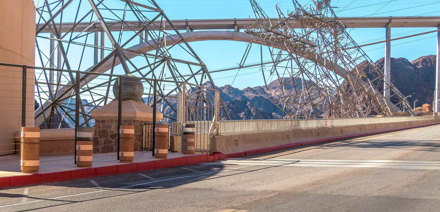 The Hoover Dam is a concrete arch-gravity dam in the Black Canyon of the Colorado River, on the border between the U.S. states of Nevada and Arizona.